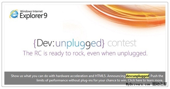 從圖中的信息可以知道,這是微軟即將舉辦的一次競賽活動,鼓勵開發(fā)人員為IE9 RC開發(fā)一些不需要插件(plugin)就可以實現(xiàn)的功能。這里并沒有提及該競賽的獎勵或是開始、截止日期。不過相信微軟會很快宣布這個活動,畢竟這是為IE9 RC準備的,而不是正式版。