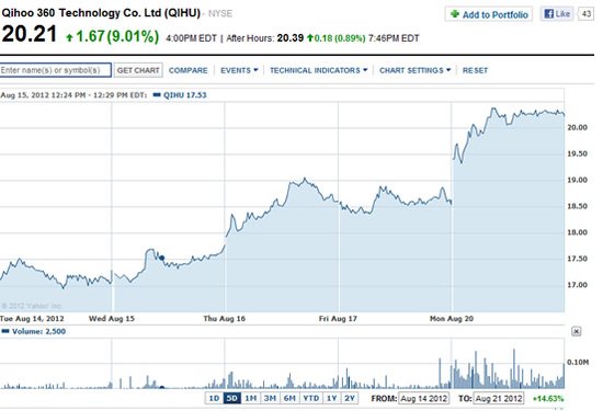 360最近股價大幅提升,截止今日360收盤價位20.21美元,上漲1.67美元,漲幅高達(dá)9.01%。自360傳出做搜索以來其股價已持續(xù)上漲。