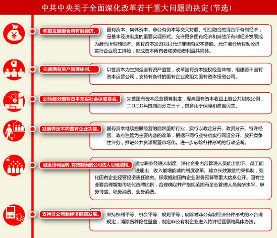 此次《決定》提出了國(guó)企改革的方向,包括積極發(fā)展混合所有制經(jīng)濟(jì)、明確國(guó)有資本繼續(xù)控股經(jīng)營(yíng)的自然壟斷行業(yè)改革內(nèi)容、提高國(guó)有資本收益上繳公共財(cái)政等引發(fā)廣泛關(guān)注。