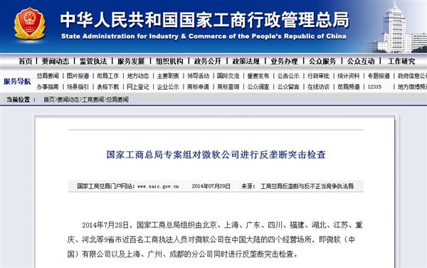 今天,國家工商總局在官網宣布,已對微軟公司涉嫌壟斷行為立案調查。2014年7月28日,國家工商總局組織由北京、上海、廣東、四川、福建、湖北、江蘇、重慶、河北等9省市近百名工商執法人員對微軟公司在中國大陸的四個經營場所,即微軟(中國)有限公司以及上海、廣州、成都的分公司同時進行反壟斷突擊檢查。
