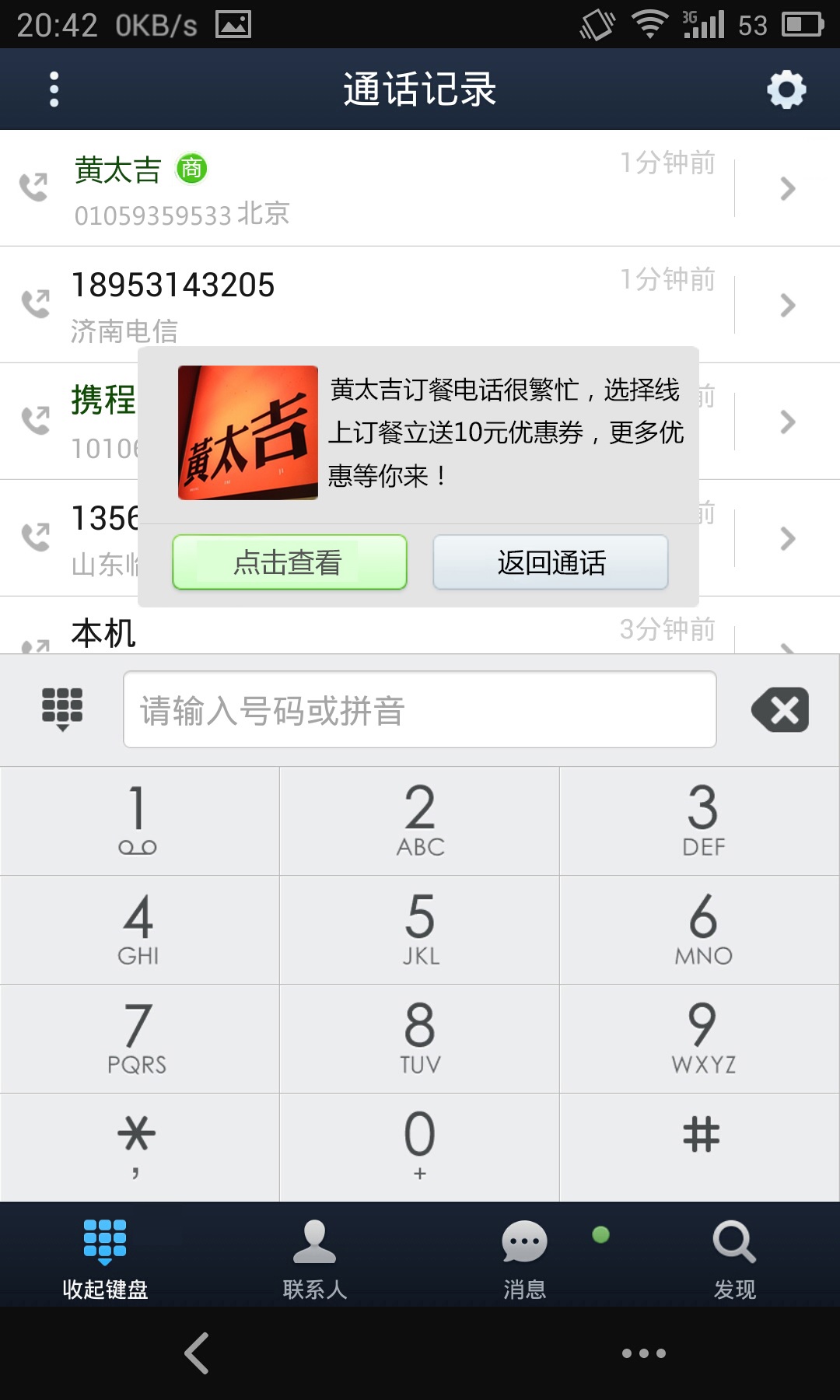 以最近人氣火爆的黃太吉煎餅為例,顧客在給黃太吉打了一個送餐電話后,即自動關(guān)注了黃太吉來店。隨后,黃太吉主動推送最新商品服務(wù)信息,顧客在360通訊錄中看到未讀信息,點擊進入后即可查看到黃太吉其他店鋪的相關(guān)信息,并可在線訂餐及商家導(dǎo)航。值得關(guān)注的是,當(dāng)中午訂餐熱線繁忙時,來店會提醒用戶轉(zhuǎn)為在線訂餐,并實時推送在線訂餐的優(yōu)惠信息,從而避免了因電話不通而造成的客戶流失。