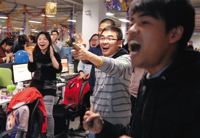 部分員工看著不斷攀升的銷售額,發出歡呼。新京報記者 李冬 攝