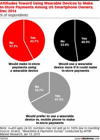 移動支付已經不是新概念,但是大部分討論都集中在手機購買上,根據2014年12月Stratos的調查顯示,可穿戴設備不能被排除在討論之外。在美國智能手機用戶中,超過2/3的人表示更喜歡用可穿戴設備在實體店支付。