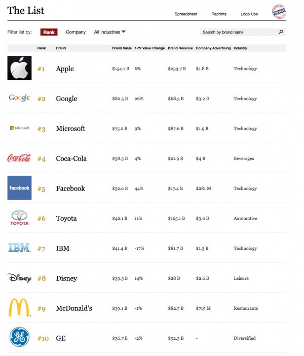 福布斯發全球最具價值品牌:蘋果連續六年榜首