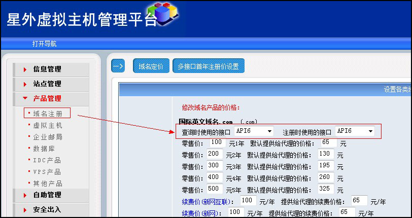 然后點擊“產品管理”——“域名注冊”,將右側的所有域名查詢接口和注冊接口都選擇“API6”,如圖: