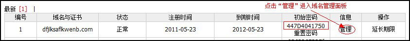 重置密碼后,會顯示一個初始密碼,點擊右側的“管理”就可以登陸域名管理面板了。如圖: