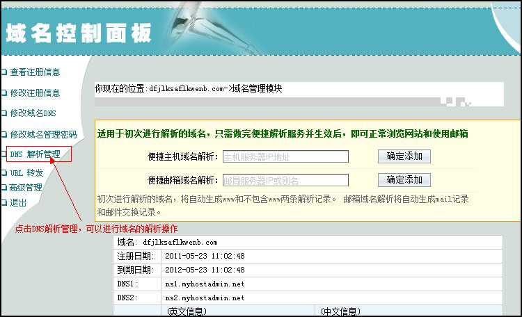 域名管理面板界面,點擊"DNS解析管理"可以進行域名解析。如圖:
